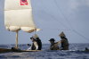 風下に進路を変え、岩との距離を稼いで帆の上端に風を入れニヌハ2を加速させる。